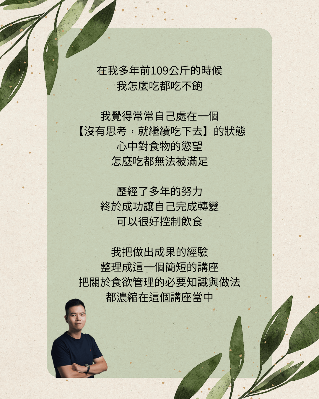 瘦下30公斤,也帶動老婆瘦身25公斤後 - IG健康主題短影片突破2000萬觀看次數 累計超過8萬粉絲追蹤 - 設計超過100道健康料理,熟悉養成健康習慣的每個環節 - 創立沐心學院,以幫助大家長期維持健康為目標,持續為健康領域做貢獻